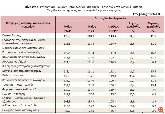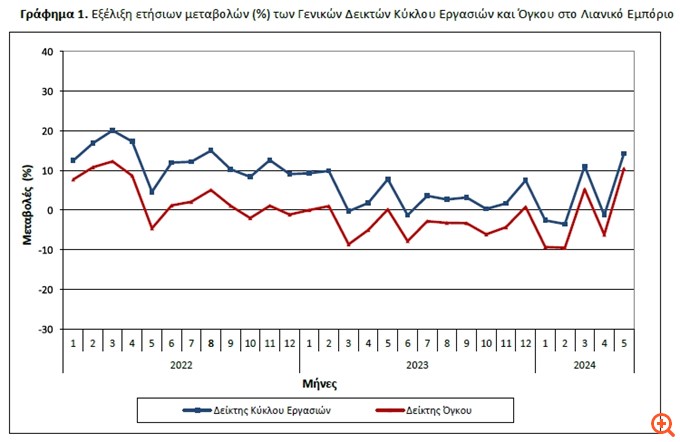 Ο Γενικός Δείκτης Όγκου (κύκλος εργασιών σε σταθερές τιμές), κατά τον μήνα Μάϊο 2024, σε σύγκριση με τον αντίστοιχο δείκτη του Μαΐου 2023, παρουσίασε αύξηση 10,5% και σε σύγκριση με τον αντίστοιχο δείκτη του Απριλίου 2024 αύξηση 11,6%, σύμφωνα με τα στοιχεία της ΕΛΣΤΑΤ.